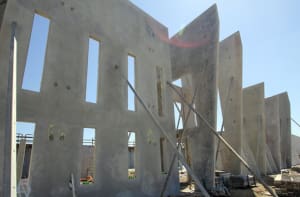 The bold angular architecture of the office can now clearly be seen from the roadway and the massive warehouse walls are scheduled to be lifted in the next few weeks. Despite rain delays early in the project, final completion is still on track for the first quarter of 2014.