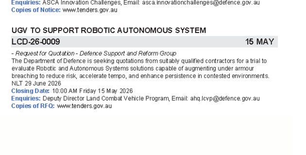 A PDF of the latest Defence Tenders can be downloaded here.