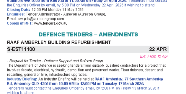 A PDF of the latest Defence Tenders can be downloaded here. Read more